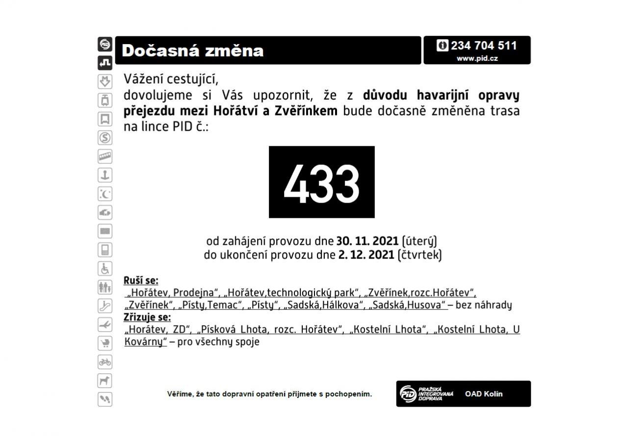 Z důvodu opravy havarijního stavu přejezdu P4943 mezi obcí Hořátev a Zvěřínek, která si žádá úplnou uzavírku dané komunikace, bude od 30. 11. 2021 do cca 2. 12. 2021 linka 433 odkloněna všemi spoji přes Pískovou Lhotu a Kostelní Lhotu.