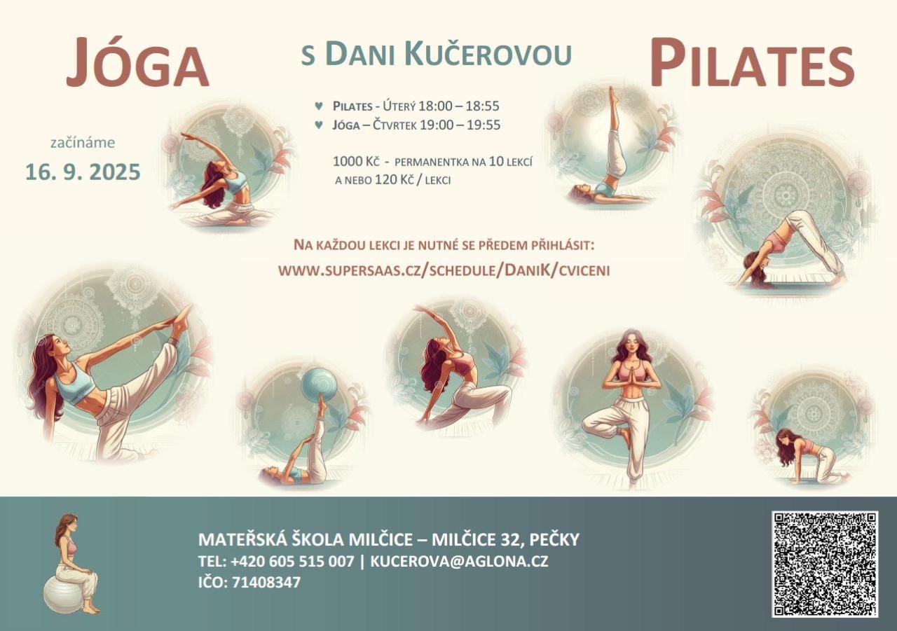 Připravte se na restart těla i mysli s Dani Kučerovou. Už od 16. září 2025 se můžete těšit v prostoru MŠ Milčice na pilates (úterý 18:00 – 18:55) a jógu (čtvrtek 19:00 – 19:55). Přijďte si zacvičit a udělejte něco pro sebe. Těšíme se na vás!