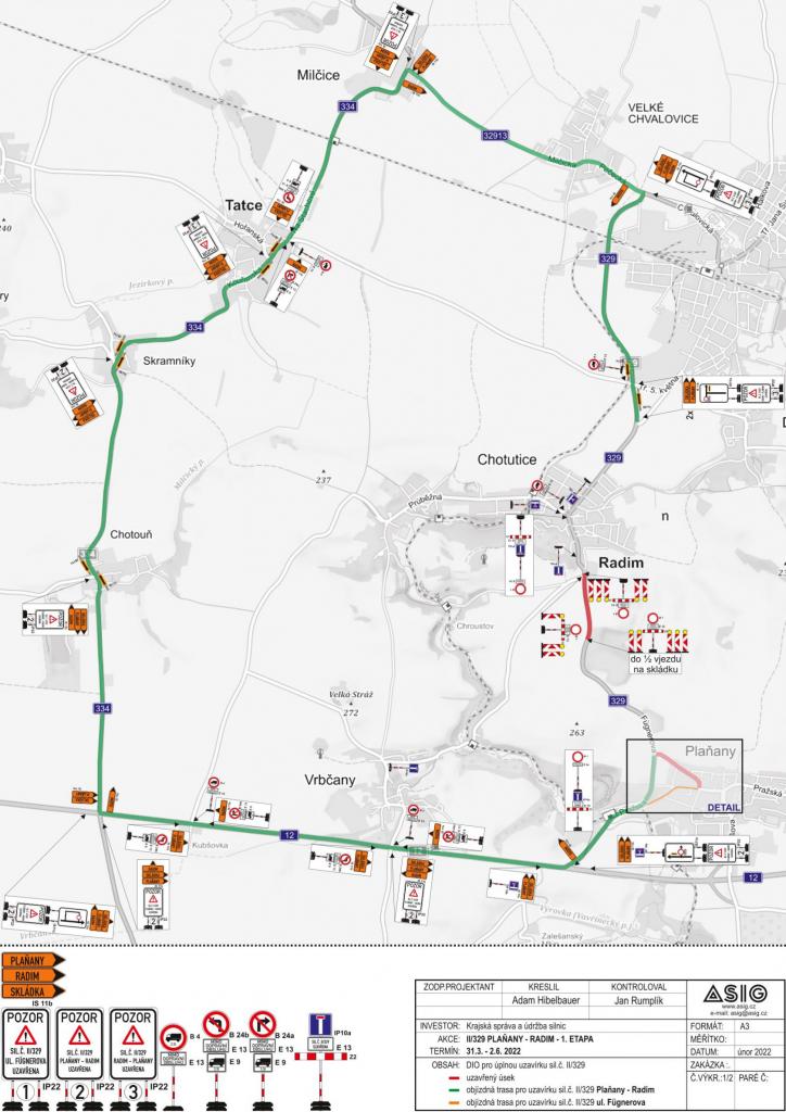 Navržená objízdná trasa: MK ul. Pražská, sil.č. I/12, II/334, III/32913, II/329